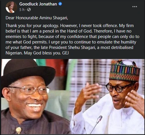 Former President Goodluck Jonathan has responded to the apology from the son of the former head of state, Aminu Shagari over the way he participated in the ouster of the fmr president.